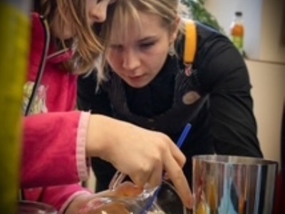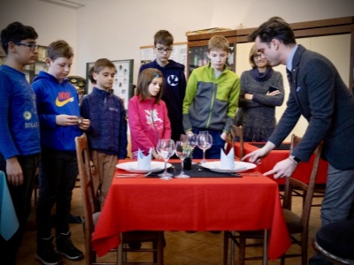 Během povídání jsme dětem přiblížili, co všechno obnáší práce v gastronomii, a hlavně jsme si vše vyzkoušeli prakticky. Nechyběla ukázka vhodného prostření, seznámení s inventářem a jeho správným použitím ani předvedení barmanské práce. Děti si s nadšením zkoušely namíchat vlastní nealkoholický drink a také si procvičily zručnost při skládání ubrousků do různých tvarů.